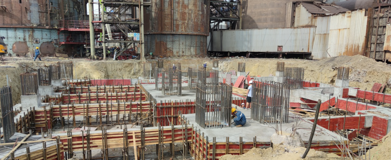 一期脫硝區(qū)域地下樁基共計38根,基礎承臺區(qū)域16個,立柱21根其中大柱(1400x140011根,小柱(800x80010根。共經歷樁基施工及澆筑、基礎場地開挖、墊層澆筑、樁基檢測、鋼筋編制、基礎支模、基礎澆筑及養(yǎng)護、土方回填等歷時70余天。于516日工序交接進入框架安裝階段。