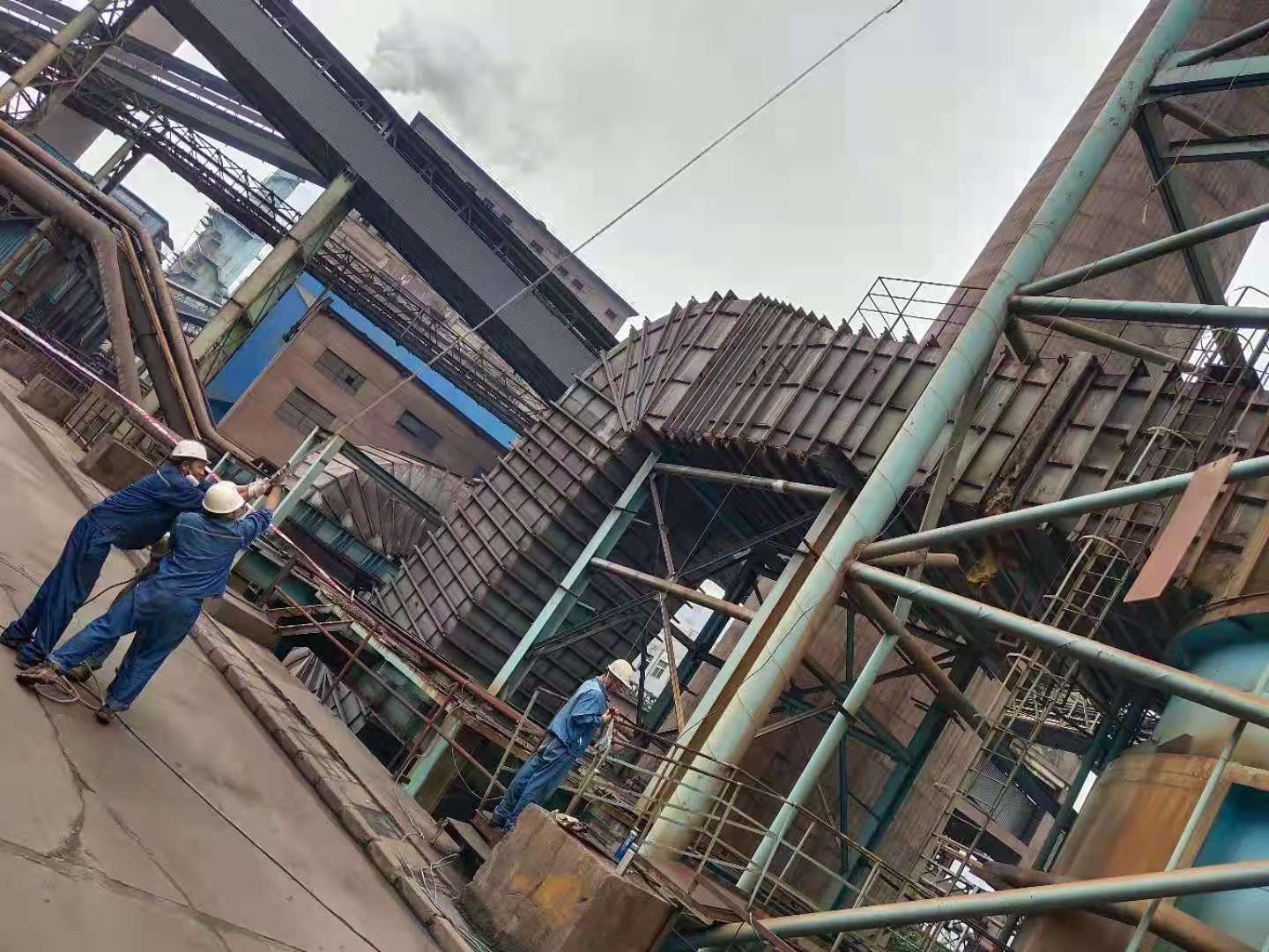 623日班前會(huì)檢修班長劉武對(duì)六燒出口在線監(jiān)測平臺(tái)鋼板更換工作做了詳細(xì)的人員部署和安全注意事項(xiàng)講解。8:30檢修組人員到達(dá)現(xiàn)場,吸收塔周邊拉好警戒線,其中3人到達(dá)除霧器平臺(tái)對(duì)地面人員進(jìn)行指揮,地面人員將鋼板掛在繩子的一端,另一端3人托攥繩子,通過定滑輪緩慢的將鋼板運(yùn)輸至除霧器平臺(tái)。采用相同的辦法,將運(yùn)輸至除霧器的鋼板又轉(zhuǎn)運(yùn)至在線監(jiān)測平臺(tái)。大家通過3小時(shí)的齊心協(xié)力,30平方鋼板全部轉(zhuǎn)運(yùn)至出口在線監(jiān)測平臺(tái)。隨后檢修人員利用4小時(shí),安全、高效的將所有腐蝕的平臺(tái)更換完畢,完成了本次安全隱患消除項(xiàng)目。