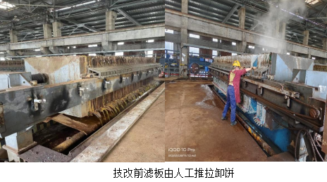 2022年3月威遠(yuǎn)藍(lán)鼎正式接手成渝釩鈦科技欣興釩廠新區(qū)水處理整套水處理系統(tǒng)。運行至今,反應(yīng)釜壓濾機平臺在用的6臺壓濾機自動卸餅功能全部損壞,每臺壓濾機87塊濾板,平均每臺卸餅在1.5小時,每班人工依次卸餅一次,最高頻次兩次,人工勞動強度大,工作效率低。高產(chǎn)期間無法滿足濾水要求,同時因為環(huán)境和勞動強度致使員工離職率高。
