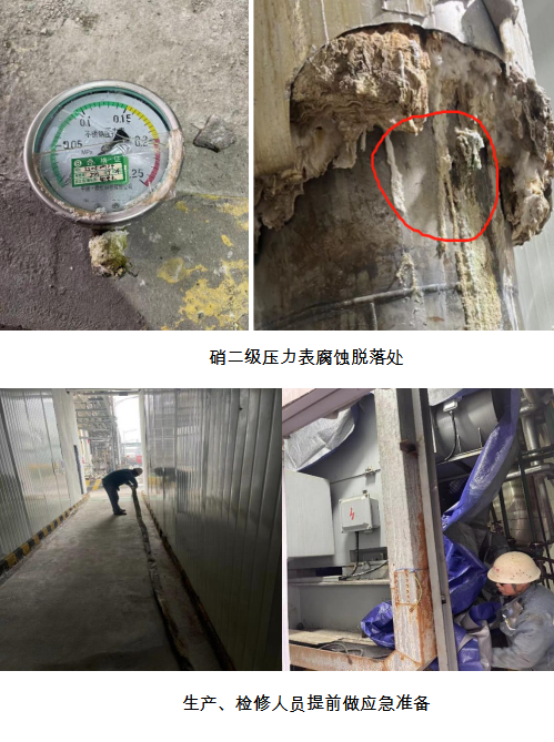 3月4日9:23分蒸發(fā)濃縮硝二級強制循環(huán)蒸發(fā)器循環(huán)管道壓力表腐蝕脫落,硝二級高濃縮液存在泄漏風險,乙班白班班長林寧和電儀唐亮發(fā)現情況后立即匯報副部長楊平,楊平立即匯報生產部長黃安軍。若硝二級壓力表脫落,內部80方高濃縮液隨時會出現泄漏,將導致重大環(huán)保事故和壓縮機電機有損壞風險。生產部隨即組織緊急停機、系統(tǒng)排空,消除潛在風險、隱患。